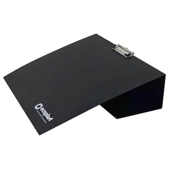 Prancheta ergonômica, de plano inclinado, com presilha metálica, tipo jacaré, com inclinação para facilitar a utilização de mesas retas, por portadores de necessidades especiais